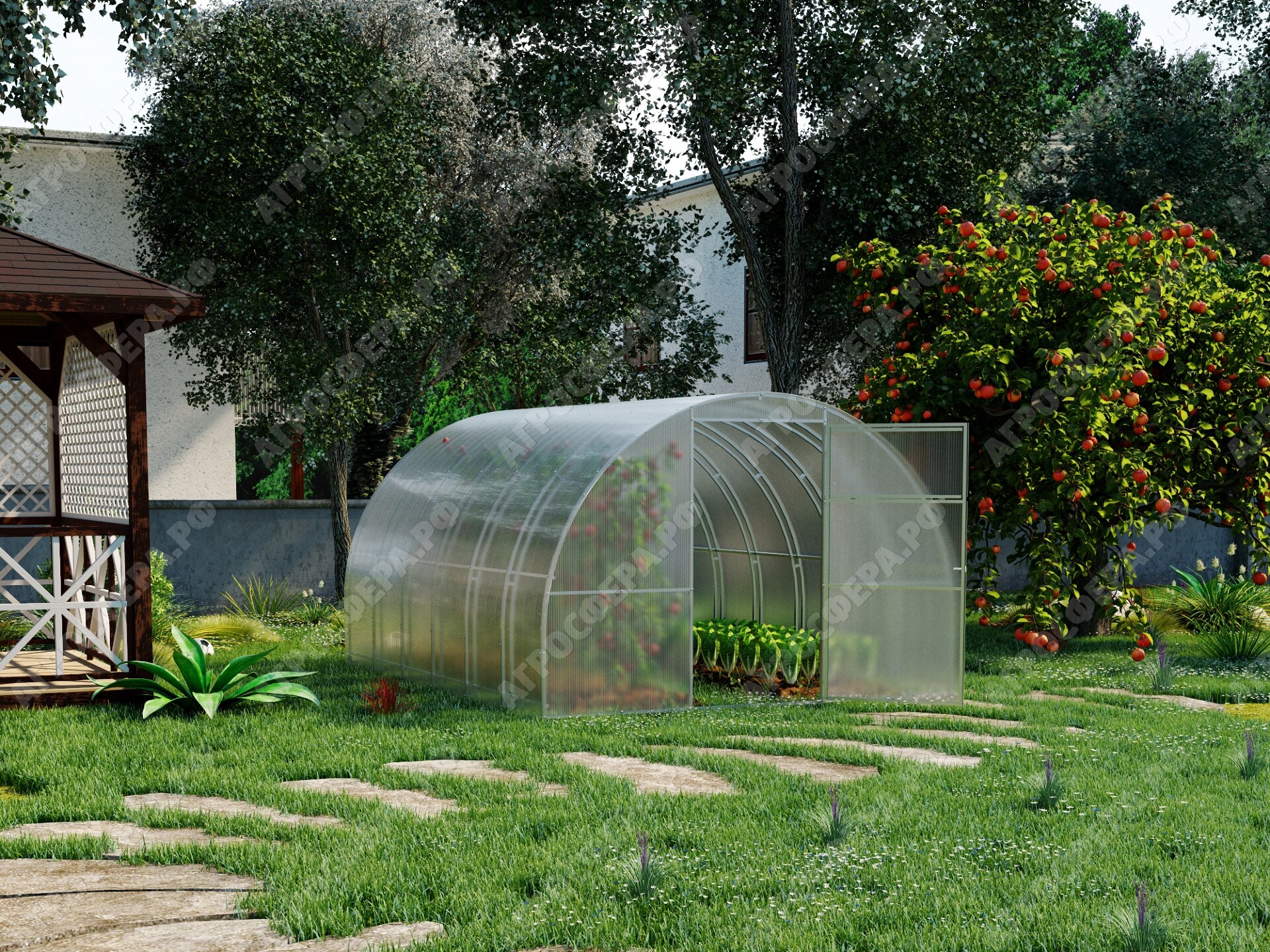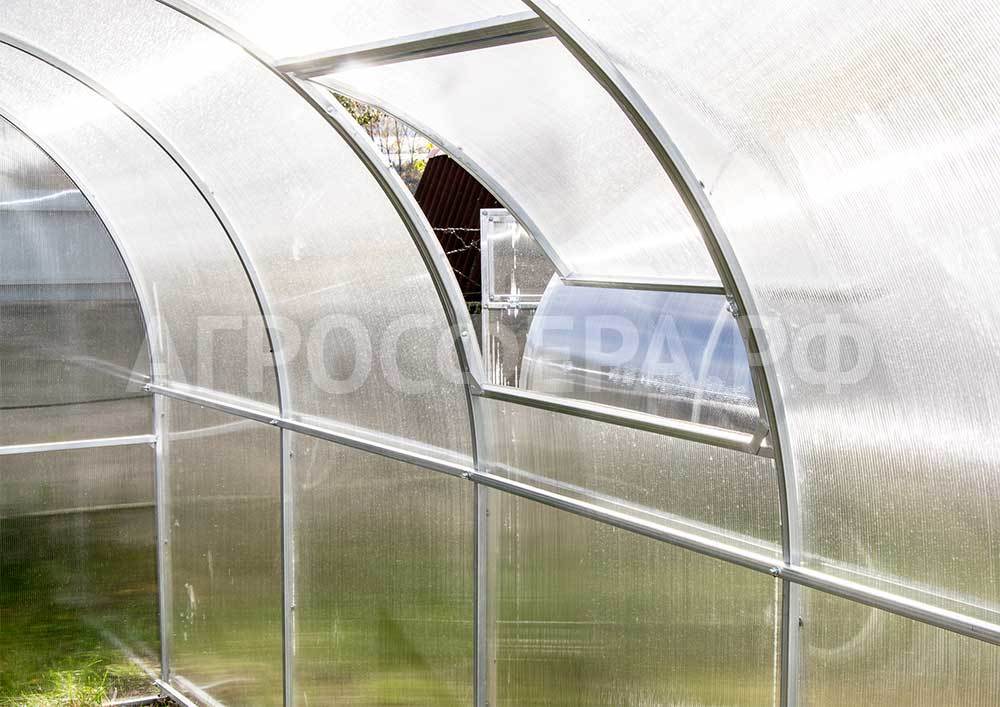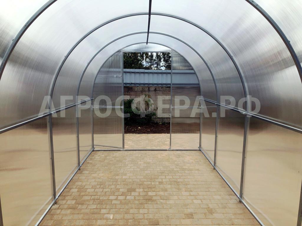 Теплица комплектуется качественным и долговечным сотовым поликарбонатом. Модель Агросфера-Фермер имеет двустворчатые двери в каждом торце; полностью совместима с дополнительными форточками, системами автопроветривания и автополива.