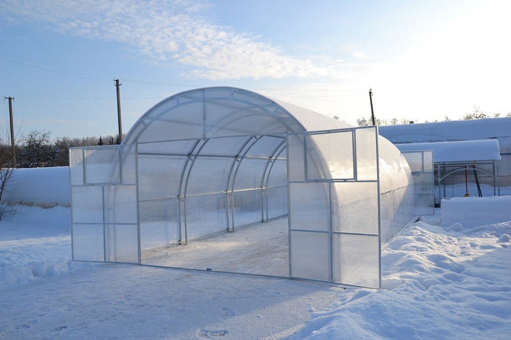 Теплица перезимовала отлично. Каркас нагревается как радиатор от малейшего просвета солнца, подтапливает снег и тот пластами съезжает с крыши. Нужно только от стенок его откидывать.