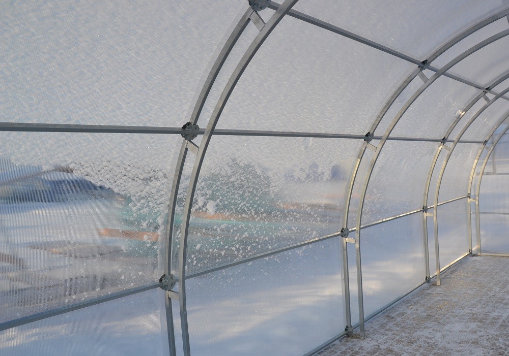 Обладая прочным сварным каркасом с увеличенным количеством дуг (шаг дуги — 67 см), теплица Агросфера-Плюс выдерживает снеговую нагрузку 70 кг на м2 (соответствует 30 см свежевыпавшего снега). Это значит, что покрытая поликарбонатом теплица спокойно переносит снежную российскую зиму.