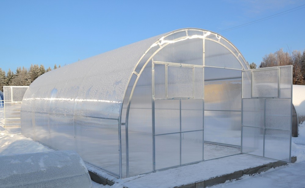 Обладая прочным сварным каркасом, теплица Агросфера-Стандарт выдерживает снеговую нагрузку 50 кг на м2 (соответствует 25 см свежевыпавшего снега). Это значит, что покрытая поликарбонатом теплица спокойно переносит суровую российскую зиму.