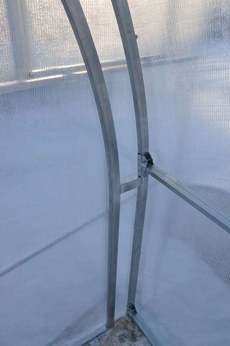 Дуги — главный несущий элемент теплицы. Для модели Агросфера-Престиж изготавливаются специальные дуги из широкой стальной трубы 30х20 мм, причём труба изогнута «на ребро». Дуги не только шире, чем в стандартных моделях, но и количество дуг в теплице увеличено (шаг дуги — 67 см), что обеспечивает более равномерное распределение снеговой нагрузки на сотовый поликарбонат. Вот почему сверхпрочный сварной каркас Агросфера-Престиж спокойно выдерживает снеговую нагрузку 150 кг на м2 (соответствует 40 см свежевыпавшего снега). Это значит, что покрытая поликарбонатом теплица прекрасно проявит себя даже в самых снежных регионах России