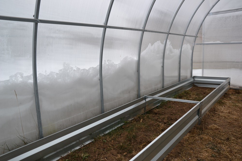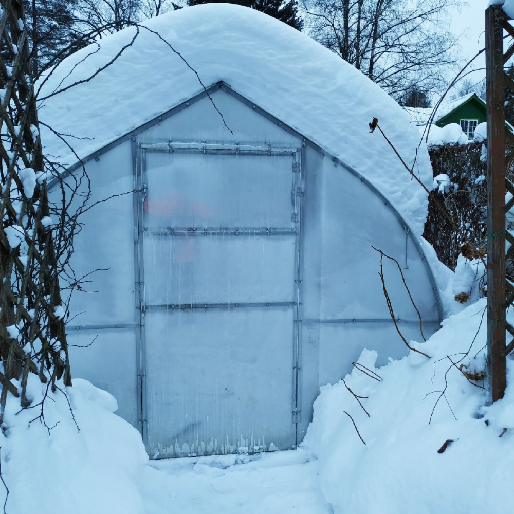 Теплица перезимовала отлично. Каркас нагревается как радиатор от малейшего просвета солнца, подтапливает снег и тот пластами съезжает с крыши. Нужно только от стенок его откидывать.
