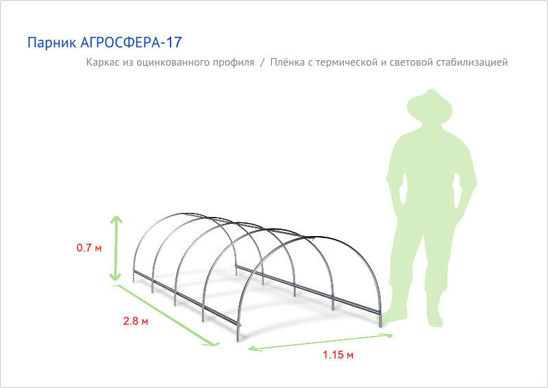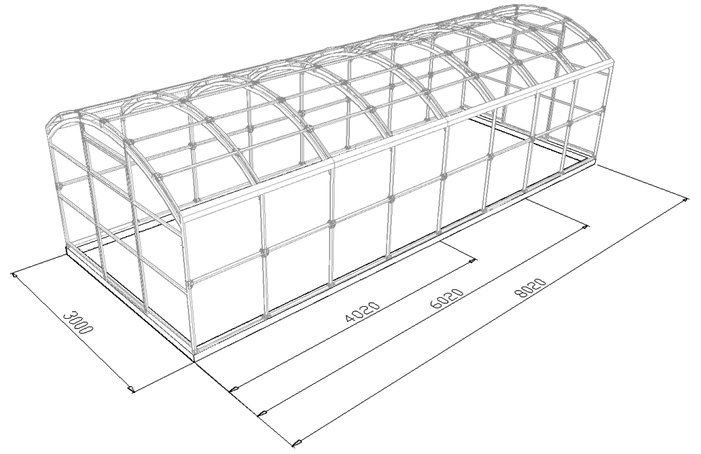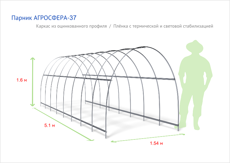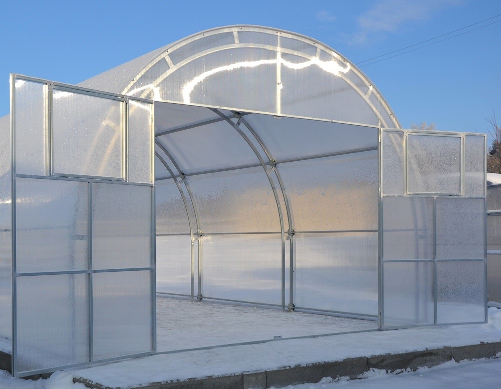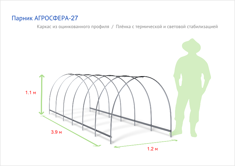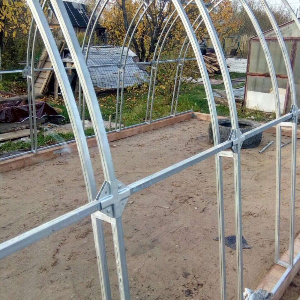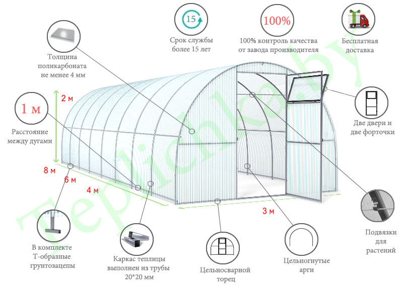 Длина теплицы: от 4 м до любой длины; шаг удлинения — по 2 мШаг дуги: 0,67 м