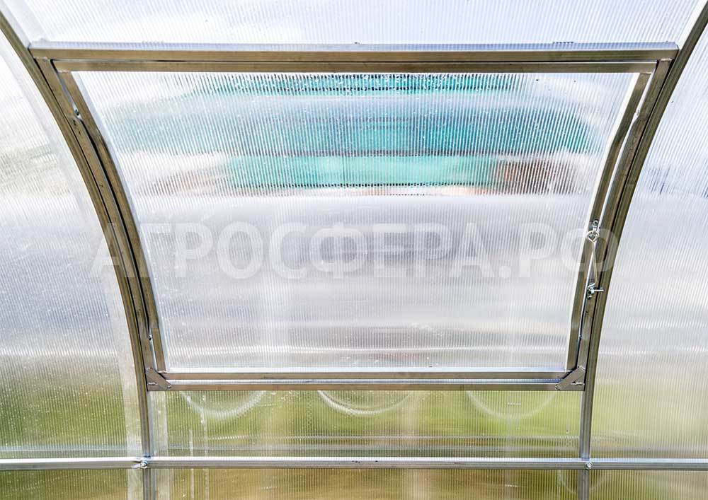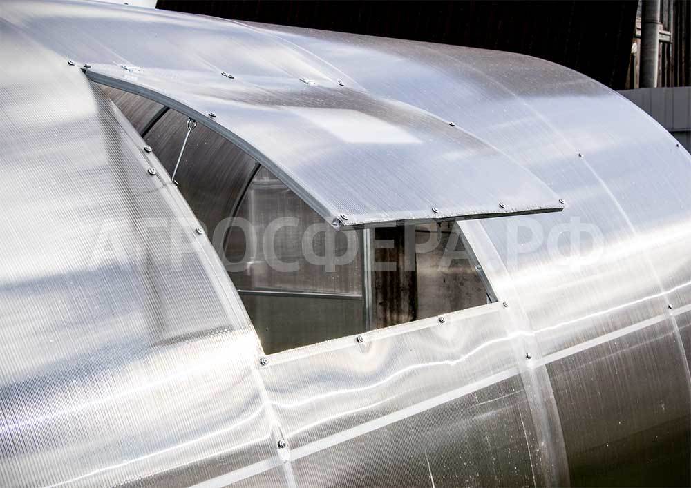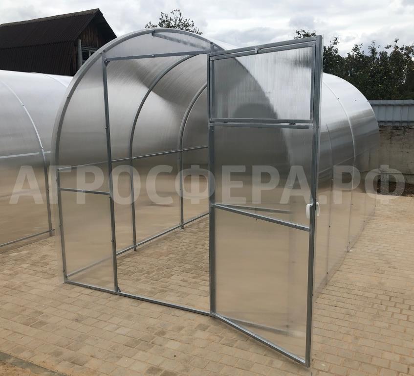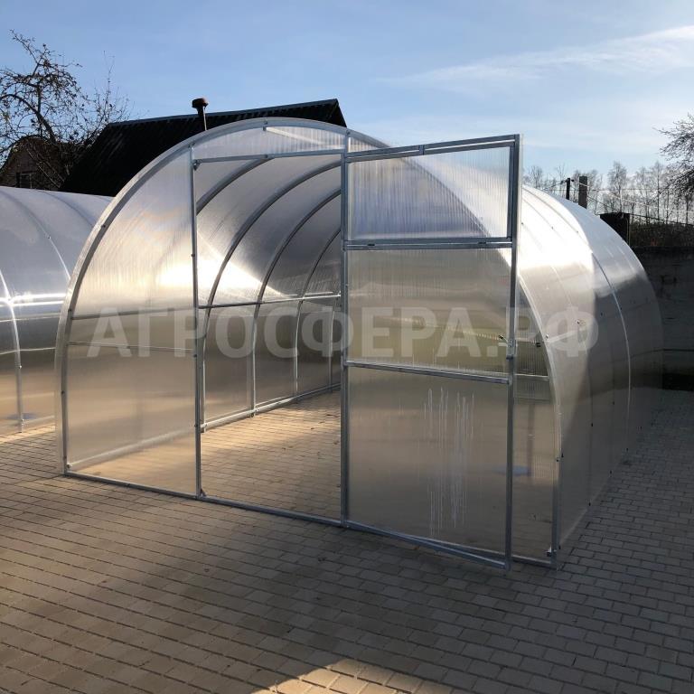 Теплица комплектуется качественным и долговечным сотовым поликарбонатом. Модель Агросфера-Фермер имеет двустворчатые двери в каждом торце; полностью совместима с дополнительными форточками, системами автопроветривания и автополива.