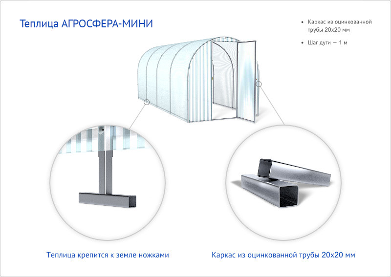 Если вы начинающий садовод или у вас небольшой приусадебный участок, то Агросфера-Мини как раз для вас. Небольшая, компактная и удобная, рассчитанная на две небольших грядки, Агросфера-Мини будет радовать вас долгие годы. В ней вы можете выращивать низкорослые помидоры, огурцы и перцы, а также, благодаря тому, что поликарбонат на зиму снимать не нужно, ранней весной, перед посадкой помидор или перцев, вы успеете вырастить рассаду овощей или цветов.